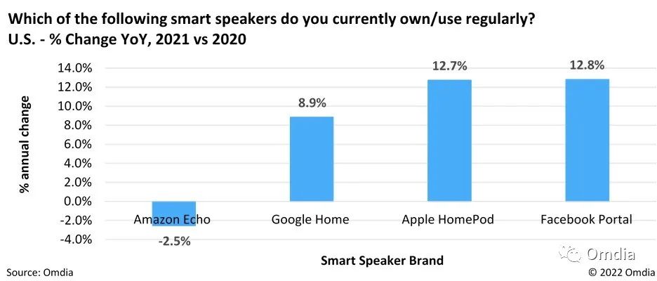 就2021年第四季度而言,亚马逊产品销量降低了78% YoY,导致其在美国智能音箱商场的比例从一年前的65%降到了2021年最终一个季度的38%。与之相反的是,虽然谷歌和苹果的2021年第四季度出货量也下降了约35% YoY,但二者的商场比例却增加了。谷歌在2021年第四季度的智能音箱出货量比例为47%,苹果则为14%,与前一年比较翻了一番。