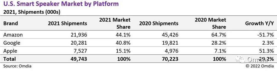 但并非该商场所有厂家的出货量都呈现了萎缩。虽然亚马逊产品在2021年与2020年比较大幅减缓,但谷歌在同一时期却完成了2%的年同比(YoY)增加,苹果的出货量增加更是达到了51% YoY。