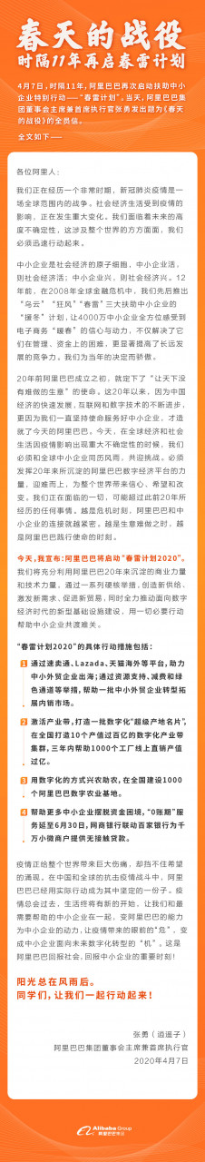 阿里巴巴集团董事会主席兼首席执行官张勇今日还宣布一封题为《春天的战争》的全员信,他在信中表明,“咱们将充分利用阿里巴巴20年来沉积的商业力气和技术力气,经过一系列硬核举动,发明新供应、激起新需求、促进新交易,一起全力推进面向数字经济时代的新式基础设施建造,用全部必要举动协助中小企业共渡难关。”